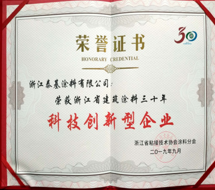 浙江泰基涂料有限公司獲得“浙江省建筑涂料三十年優(yōu)秀企業(yè)”榮譽稱號。總經(jīng)理周航帆獲得“浙江省建筑涂料三十年優(yōu)秀企業(yè)實力新人獎”。
