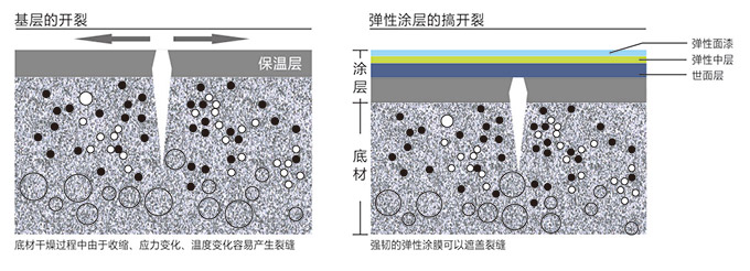配套各種彈性面漆、組合成彈性涂膜,創造出多種立體花紋,起到彌蓋裂縫的效果