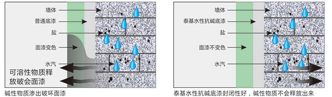 泰基漆在大量實踐中發現,由于常規性底漆抗堿性能非常有限,使得墻面條件變化以及施工的疏忽,都可能引起底漆封閉失效,從而導致面漆褪色、脫落。為此泰基漆推出了功能特異的抗堿底漆,此底漆通過丙烯酸分子鏈上接技環氧基因而改性,增強了傳統底漆的抗堿、抗鹽的功能。